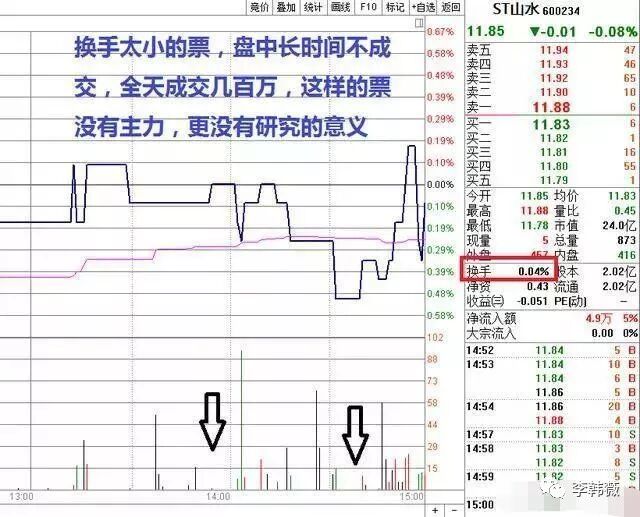 相对于高换手率,那些盘中走一字,甚至很长时间不成交的低换手率的个股风险更大。首先,低换手不利于主力的进场和离场。每天只有一点点换手,主力要进场,买一点点筹码,立刻会在成交量上表现出来,立刻会被其他人发现,同时因为成交清淡,想进场也收集不到筹码;其次,在离场的时候,因为换手低,成交清淡,想出货但是谁来接盘呢?稍微一卖就跌停了,想卖也卖不出去。因此,低换手的票基本上没有什么主力行为,也不是我们关注的对象!